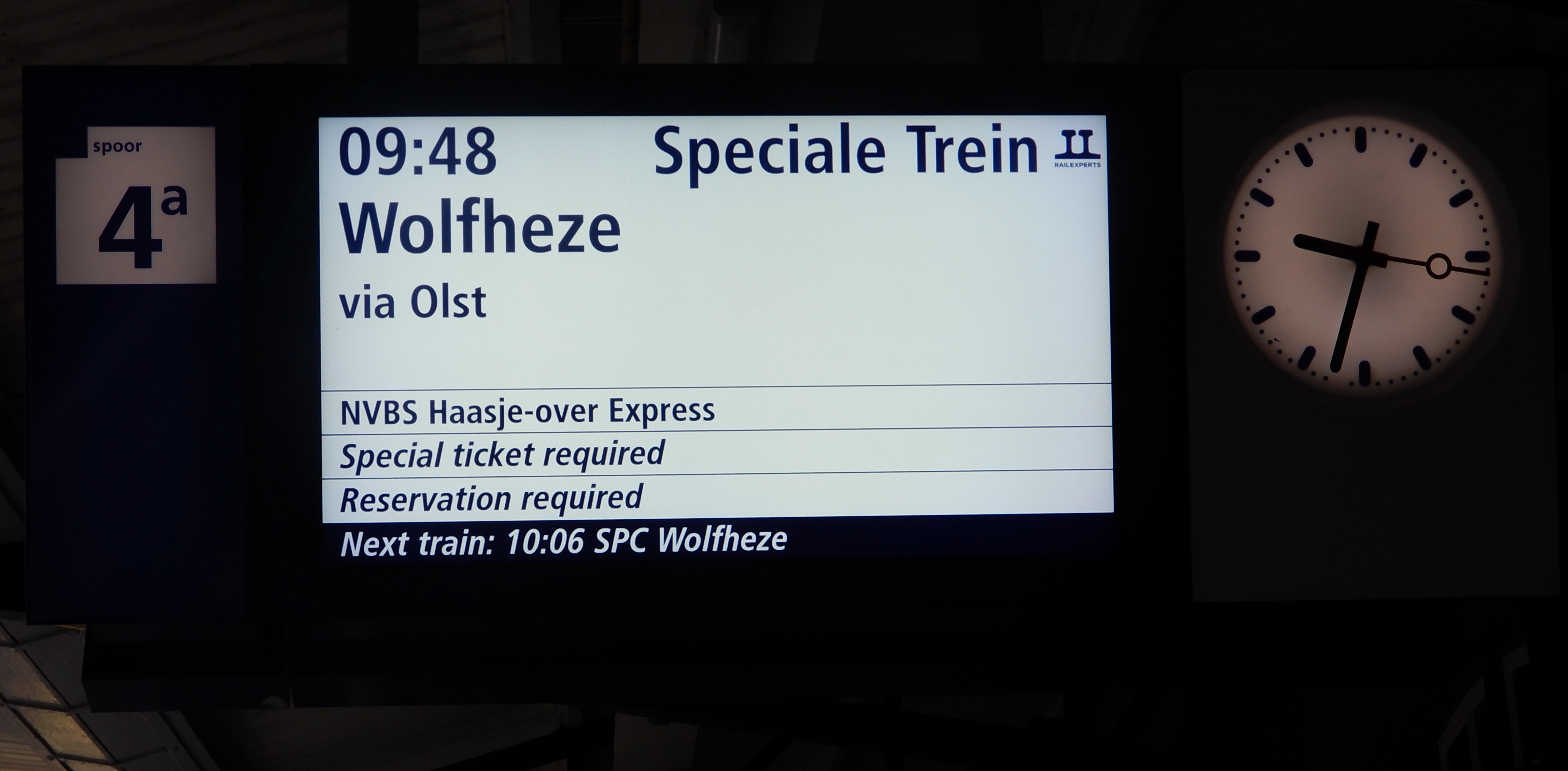 Op 29 oktober jl. wordt er dan toch een excursie onder die noemer gehouden. Daartoe verzamelen zich op station Amersfoort Centraal 155 deelnemers. De route is geheim gehouden. Om daar achter te komen moeten wij dan nu maar vertrekken. Met de tekst op de treinaanwijzer in Amersfoort wordt het eerste deel van de sluier opgelicht: Wolfheze via Olst. Uit het programmaboekje dat wij kort na vertrek krijgen, blijkt hoe kunstig zowel de route als het boekje door het SNE-team in elkaar zijn gezet. Kijk maar eens wat er nu gebeurt.