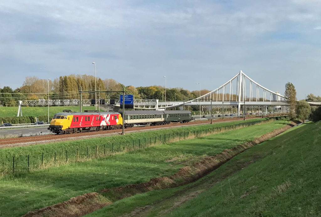 mP 3029 met rijtuigen rijdt langs de A12 bij Zoetermeer. Foto: Zeger Hoffmann.