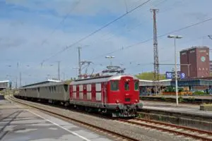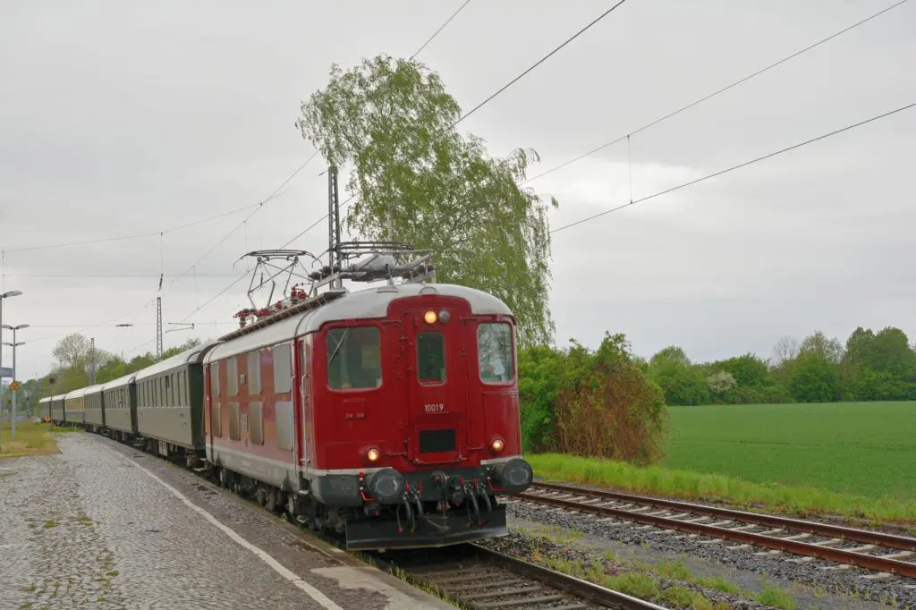 Kwart over tien kwam de excursietrein DPE 1898 achteruit het station van Viersen binnenrijden. Waarom achteruit? De trein was uit Mönchengladbach gekomen en had buiten Viersen de gelegenheid voor kopmaken gebruikt. Een aantal was de groep van rond tweehonderd deelnemers aan deze Koningsdagrit – de 900e NVBS-excursie sinds 1931 – vooruit gereisd en kon al genieten van de vele doorkomende goederentreinen, sommige onmiskenbaar uit Nederland richting Keulen of na kopmaken noordwaarts naar Mönchengladbach en verder. De vroege instappers maakten van de gelegenheid gebruikt om met papieren zakdoekjes de ruiten schoon te maken. De combinatie van stof en de op dat moment vallende regen was niet bevorderlijk voor helder zicht. De uit ex SBB-materieel bestaande trein, versterkt met een ex DB-barwagen bleken ondanks hun gevorderde leeftijd nog over prima rij-eigenschappen te beschikken. Tot vreugde van velen konden de ramen open. Ze konden volop van de rit genieten, getuige de regelmatige verstoppingen van het gangpad. De zeventig jaar oude Re4/4 10019 van de huidige eigenaar Centralbahn liet zich noch door de last noch door het niet te fraaie weer uit het veld slaan. De machinist had er merkbaar zin in. Met gezwinde spoed naar de korte stop in Mönchengladbach waar gelijk de eerste foto’s konden worden gemaakt.