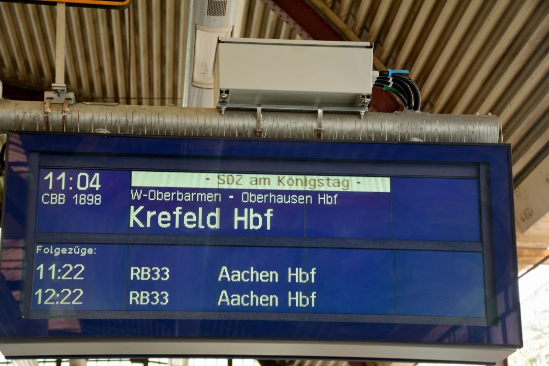 Wie vaker naar Keulen is gereisd herkende tussen Mülheim en Leverkusen de splitsing van de lijnen richting Düsseldorf en Wuppertal. Onze trein koos de laatste en niet veel later passeerden we Opladen, waar lang de BR 103 Schnellfahrlokomotiven in het inmiddels gesloten en afgebroken Ausbesserungswerk werden gereviseerd. Daar gingen we over op het hoofdspoor. In Solingen zagen we, weliswaar in een flits, de Abellio-dieseltrein klaar staan voor de rit over de Müngstener Brücke naar Wuppertal-Oberbarmen, de volgende fotostop. De aansluitingen bij Gruiten waren uit de rijdende trein niet goed waarneembaar, spoedig volgden de stations van Wuppertal, waaronder Hauptbahnhof, waar de trein onder de wachtenden op een IC aandacht trok. In Wuppertal-Oberbarmen konden de fotografen genieten van een in Bundesbahnuitmonstering gestalde V100 met een aantal zelflossers en van de diverse treinen van National Express, DB, Abellio (terug naar Solingen, toch een beetje NS) en doorrijdende goederentreinen. Wederom volgde een flinke rit richting Hagen waar de trein over de hoge (goederen)sporen door het station reed, vervolgens via een driehoek over de goederensporen van Hagen Vorhalle naar Witten. Hier ging de trein weer over op reizigersspoor langs Bochum Langendreer en het hoofdstation via Herne over het goederenspoor richting Gelsenkirchen (waarheen in de stoomtijd een NVBS-excursie is gehouden) en ooit laag gelegen station van Bottrop naar de fotostop in Oberhausen Osterfeld Süd aan de S-Bahn S9, een halte aan de rand van het rangeerterrein. Gedurende de korte fotostop kwamen twee goederentreinen voorbij.