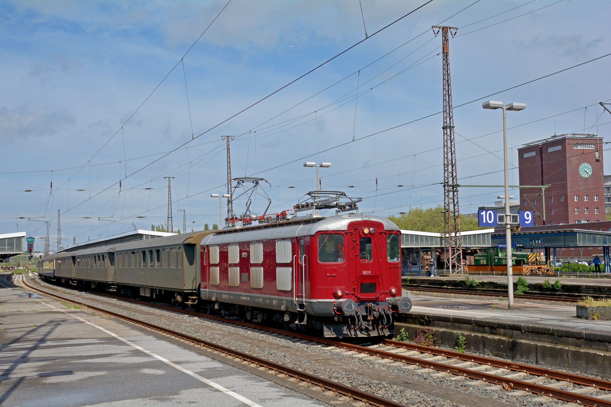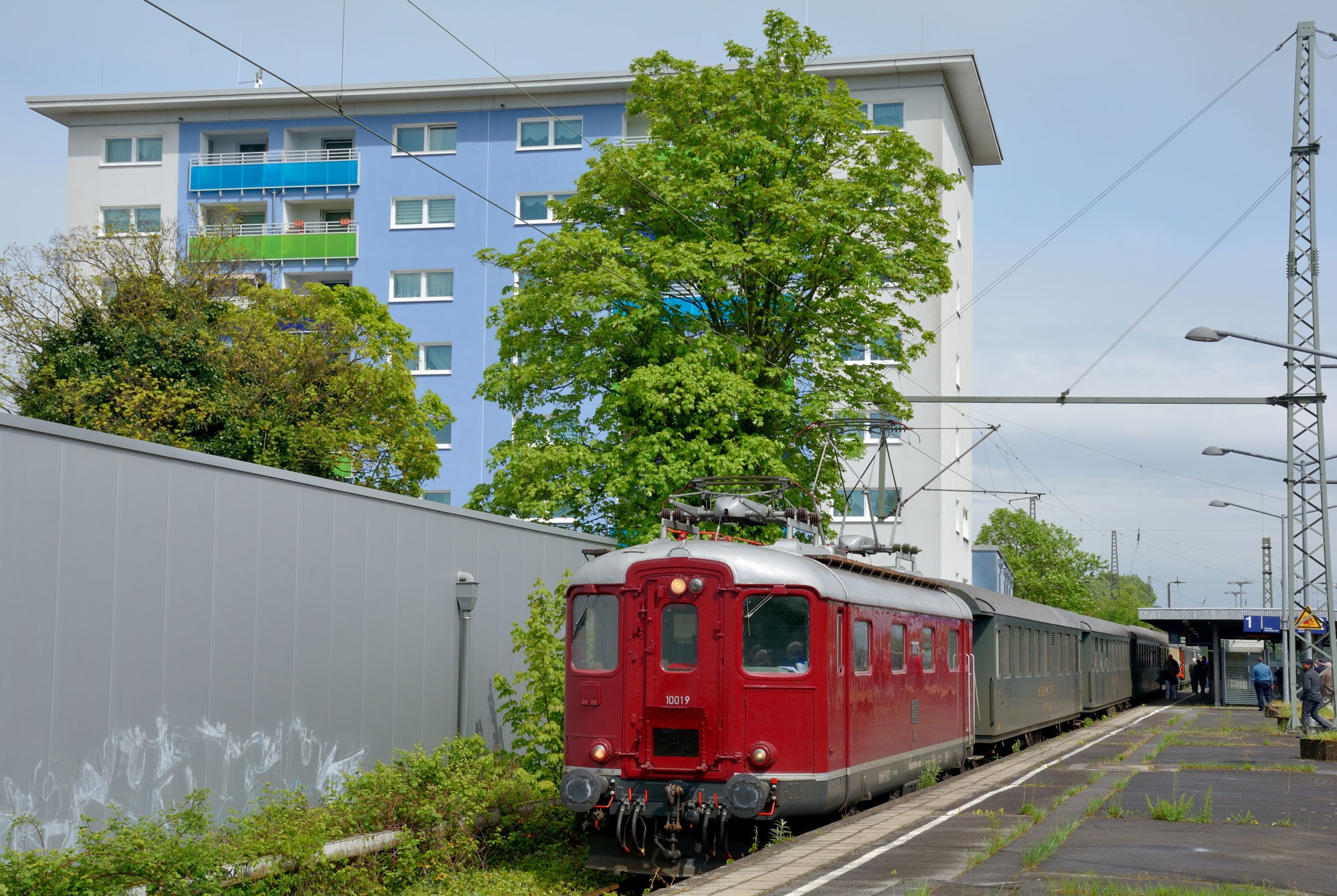 Kwart over tien kwam de excursietrein DPE 1898 achteruit het station van Viersen binnenrijden. Waarom achteruit? De trein was uit Mönchengladbach gekomen en had buiten Viersen de gelegenheid voor kopmaken gebruikt. Een aantal was de groep van rond tweehonderd deelnemers aan deze Koningsdagrit – de 900e NVBS-excursie sinds 1931 – vooruit gereisd en kon al genieten van de vele doorkomende goederentreinen, sommige onmiskenbaar uit Nederland richting Keulen of na kopmaken noordwaarts naar Mönchengladbach en verder. De vroege instappers maakten van de gelegenheid gebruikt om met papieren zakdoekjes de ruiten schoon te maken. De combinatie van stof en de op dat moment vallende regen was niet bevorderlijk voor helder zicht. De uit ex SBB-materieel bestaande trein, versterkt met een ex DB-barwagen bleken ondanks hun gevorderde leeftijd nog over prima rij-eigenschappen te beschikken. Tot vreugde van velen konden de ramen open. Ze konden volop van de rit genieten, getuige de regelmatige verstoppingen van het gangpad. De zeventig jaar oude Re4/4 10019 van de huidige eigenaar Centralbahn liet zich noch door de last noch door het niet te fraaie weer uit het veld slaan. De machinist had er merkbaar zin in. Met gezwinde spoed naar de korte stop in Mönchengladbach waar gelijk de eerste foto’s konden worden gemaakt.