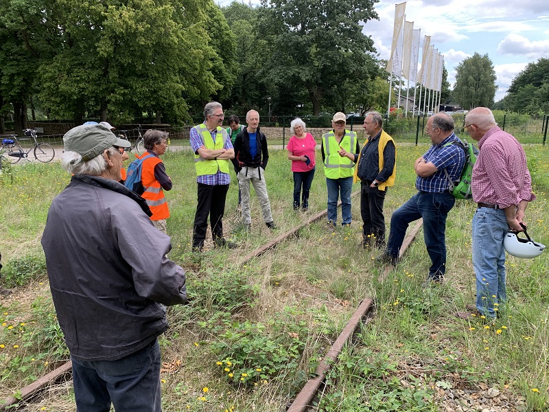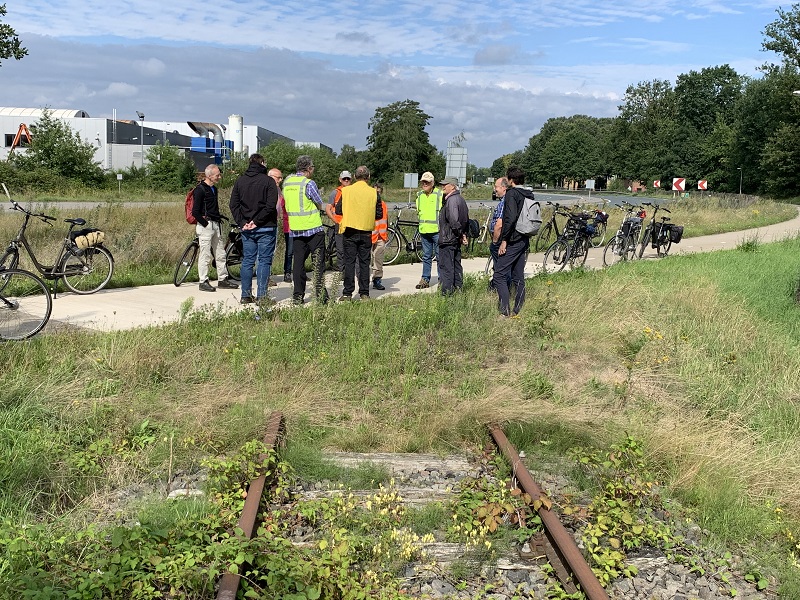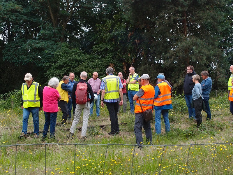 Ondanks de bijna 30 jaar durende doornroosjesslaap is er anno 2023 nog veel te zien, temeer omdat de lijn formeel nog bestaat en alleen het hoogstnoodzakelijke is weggehaald. Ons medelid Coen Thevissen uit Herkenbosch heeft zich in de historie van de lijn verdiept en er in juni van dit jaar een lezing bij de NVBS-afdeling Zuid-Limburg over gehouden. Als vervolg op die lezing organiseerde de afdeling Zuid-Limburg deze fietstocht in samenwerking met de SNE en Coen was onze gids. Hij wist ons naar bijzondere plekken van het tracé te leiden, die veelal alleen op de fiets te bereiken zijn. Vanuit Roermond werd naar De Herkenbosche gefietst, de golfclub bij het voormalige station Herkenbosch. Daar voegden zich nog vijf deelnemers bij ons. Op het terras werd genoten van koffie en – uiteraard – Limburgse vlaai. Tevens schoven ons erelid Kees van de Meene en zijn echtgenote aan. Zoals bekend mag worden verondersteld heeft Kees in de tweede helft van de jaren vijftig indrukwekkende foto’s in Herkenbosch en op Vlodrop-station gemaakt en is er alleszins een band tussen hem en dit deel van de IJzeren Rijn ontstaan.