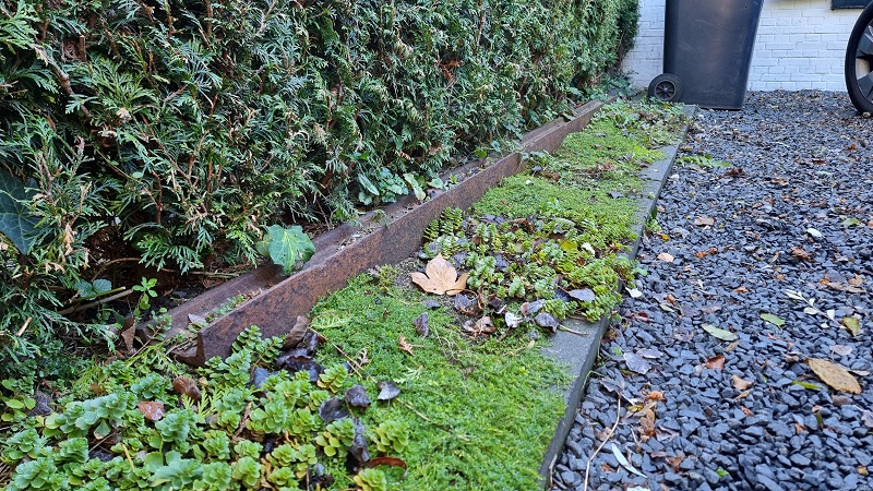 Een spoorstaaf in de tuin direct naast het voormalige tramtracé, 5 oktober 2024. Foto: Paul Nienhuis.