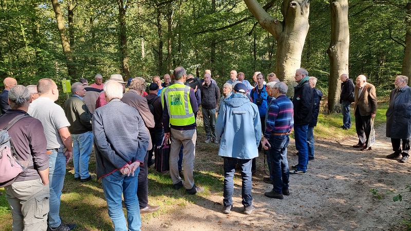 Het innamepunt voor water uit de Heelsumse Beek was met de aanleg van Rijksweg 50 in de jaren 70 van de vorige eeuw van het toneel verdwenen, net als de twee haakse bochten die hier in de Rijksstraatweg hadden gezeten. De wisselplaats bij Heelsum konden we hooguit in onze fantasie en het Speurboekje nog zien en de passage door de Dorpsstraat in Renkum leek gezien alle voetgangersgebieden en wegversmallingen ook aan onze neus voorbij te gaan. Maar dan hadden we toch buiten het vernuft van onze reisleider Ronald Bokhove en chauffeur Gerrit Verhaaf gerekend. Zij waren erin geslaagd aan de westkant van het dorp met wat kruipdoor-sluipdoor toch nog een route te ontwerpen die een deel van het oude tracé meepakte! Onze chauffeur oogstte applaus toen hij op 6 oktober ook met de grote bus het rondje rond de AH in Renkum wist te maken en zo net even wat meer van het tramtracé wist af te leggen. Opgetogen vervolgden we onze weg richting Wageningen en onderweg zagen de zuilen van de ingang van het landgoed Oranje Nassau’s Oord, er duidelijk nog hetzelfde uit als op de foto van de wisselplaats in ons Speurboekje. Hierna ging het de Wageningse Berg op waarbij we ons konden voorstellen dat de wat zwakkere stoomlocomotieven hier wel eens moeite hadden hun passagierswagens de helling op te trekken. Bovenop de berg sloegen we af naar het centrum van Wageningen. Op 6 juli konden we doorrijden tot de wisselplaats bij het beroemde hotel De Wereld. Vandaar moesten we een stukje terug waar de tram vroeger doorreed maar daarna langs de noordkant van de stad had moeten rijden omdat de vroede vaderen destijds zo’n gevaarlijk stoommonster niet in hun centrum duldden! Op 5 oktober hoefden we ons niet af te vragen of we de draai bij de Wereld zouden kunnen maken, want de weg was afgesloten. Wel maakten we op die dag een stop bij het busstation in Wageningen om een vertraagde deelnemer op te pikken. Aan de westkant van Wageningen bij de Nude reden we langs een wisselplaats en de villa Nudenoord waar een van de deelnemers nog een mooie foto met trambaan van kon laten zien. Buiten Wageningen ging het in rechte lijn naar de Grebbeberg. De Ooster Stoomtramweg Maatschappij, voorloper van de NBM, had in jaren 80 van de 19de eeuw een baan onderlangs de berg ontworpen omdat de heuvel veel te steil was en de gemeente Rhenen, anders dan Veenendaal, wel iets zag in de tram. Aangezien de HSM geen bezwaar had tegen een gelijkvloerse kruising van de tram met haar spoorlijn Amersfoort – Kesteren, kon de OSM ook naast het station een eigen remise bouwen. Het eerste deel van het eigen tracé onderaan de berg is nu een wandel/fietspad dat doorloopt naar Rhenen en dat gaf ons de gelegenheid dat lopend te verkennen. Halverwege loopt het tracé iets omhoog en daalt het pad, maar we konden wel even met een trap op het tracé komen waar natuurlijk direct onderzoek gedaan moest worden naar de ter plekke aangetroffen stenen. Onderaan het talud zijn nog enkele hectometerpalen in rails te zien, al viel dat met de rijke begroeiing van het zomerseizoen niet mee.