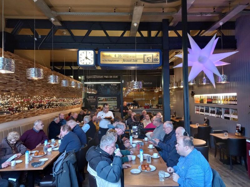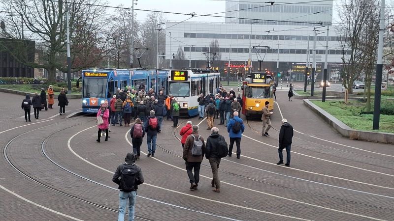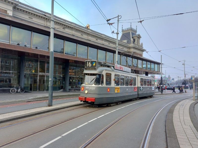 Het was waterkoud en grijs in Amsterdam die zaterdag 28 december 2024. Op station Amstel bleven veel tramliefhebbers dan ook maar tochtvrij binnen staan om te wachten op hun tram. En dat was niet zomaar één tram maar een collectie van drie historische trams van de Electrische Museumtramlijn Amsterdam die de jaarlijkse Oliebollenrit van de SNE reden. Een ingenieus rijschema zorgde er voor dat drie groepen met in totaal 131 deelnemers, elk een traject van ongeveer een uur met een van deze trams konden rijden. Daarvoor moest dus wel worden op- en overgestapt op de stations Amstel en Muiderpoort.