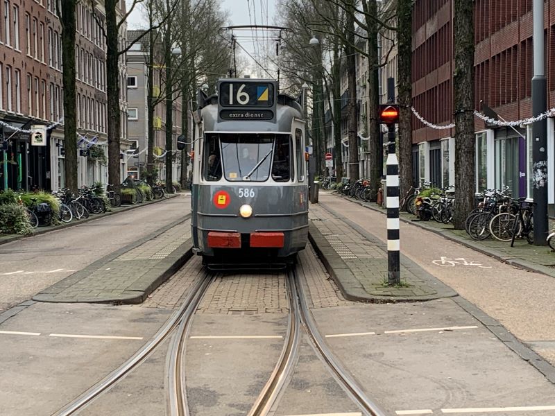 Tram 586 op het strengelspoor in de Czaar Peterstraat. Foto: Ronald Bokhove.
