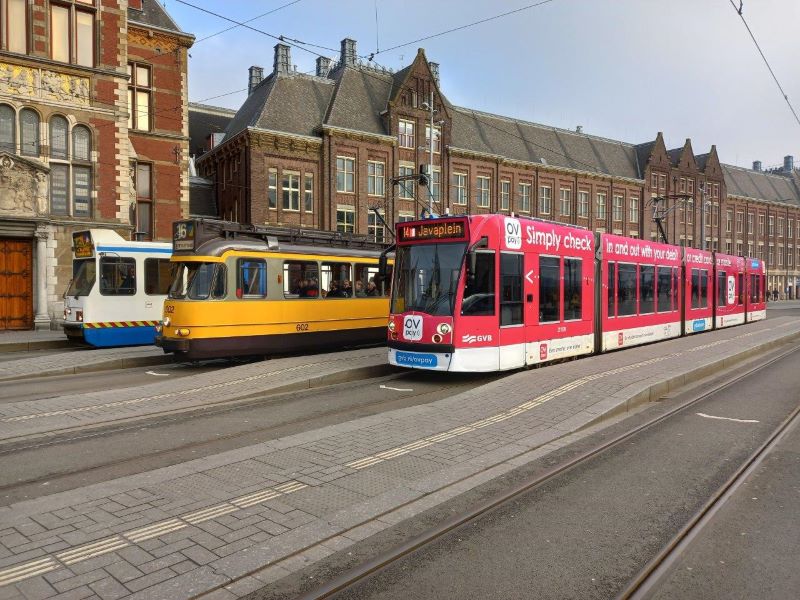 Tram 602, 919 en Combino 2109 als lijn 14 voor het Centraal Station. Foto: Hendrik-Jan Bakker.