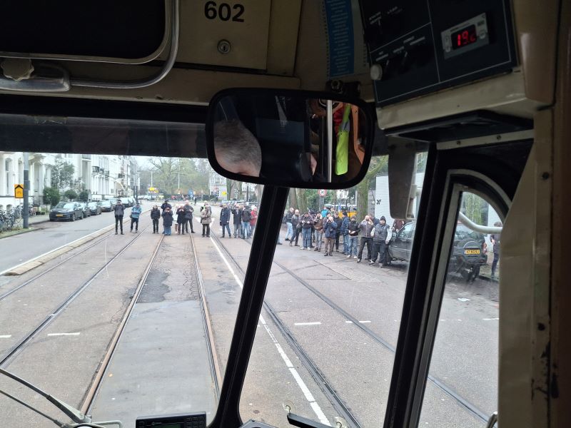De bestuurders en conducteurs van de EMA hadden er zin in, ook in de oliebollen die hun voor hun eerste rit al werden aangereikt. Het aantal fotostops werd spontaan uitgebreid. “We hebben hier wel even de tijd voor een extra stopje”. “Onze app zegt dat lijn 24 vertraagd is, kunnen we mooi even om de hoek stoppen”. “Dienstwagen lijn 1 is vervallen, we hebben ruim de tijd voor foto’s”. Dat laatste zorgde voor wat reguliere instappers die – ook al was de kleur en de vorm van de tram afwijkend van de diensttram – er voetstoots van uitgingen dat we lijn 1 waren. Tram 586 had wat vertraging opgelopen en de bestuurder loste dat op door te tonen hoe het rijden in pré-Combino-tijden ging. Toen kende de bestuurder slechts twee snelheden: stilstaan en zo hard mogelijk rijden. De tijd tussen beide toestanden diende zo kort mogelijk te zijn. Prachtig om te zien – en te horen – dat dit materieel daar nog steeds toe in staat is.
