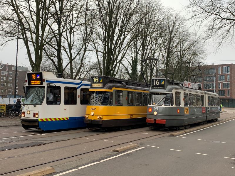 Een diensttram van lijn 12 naast de EMA-exemplaren 602 en 919 bij het Amstelstation. Foto: Rob Zoomer.