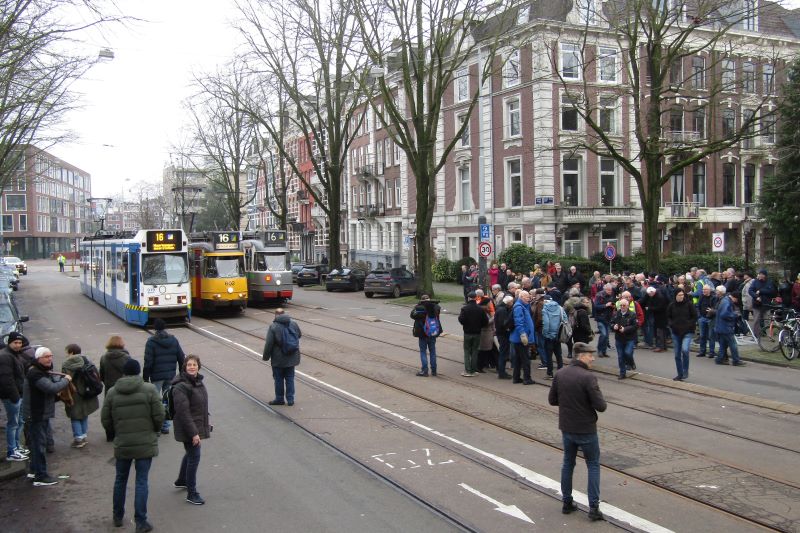 Overzichtsfoto van drie EMA-trams en tientallen deelnemers op de Plantage Parklaan. Foto: Roos Bongers.