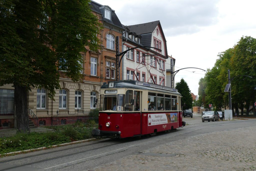 Motorwagen 51 in Naumburg bij de halte Jägerplatz, 31 juli 2022. Foto: Paul Muré.