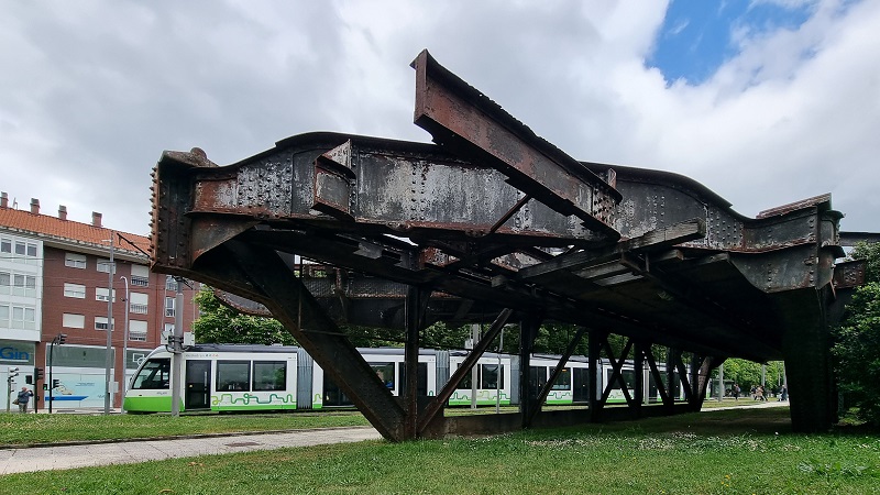 Monument gemaakt van een oude spoorbrug in Vitoria-Gasteiz nabij de tramhalte Euskal Herria, 16 mei 2023. Foto: Paul Nienhuis.