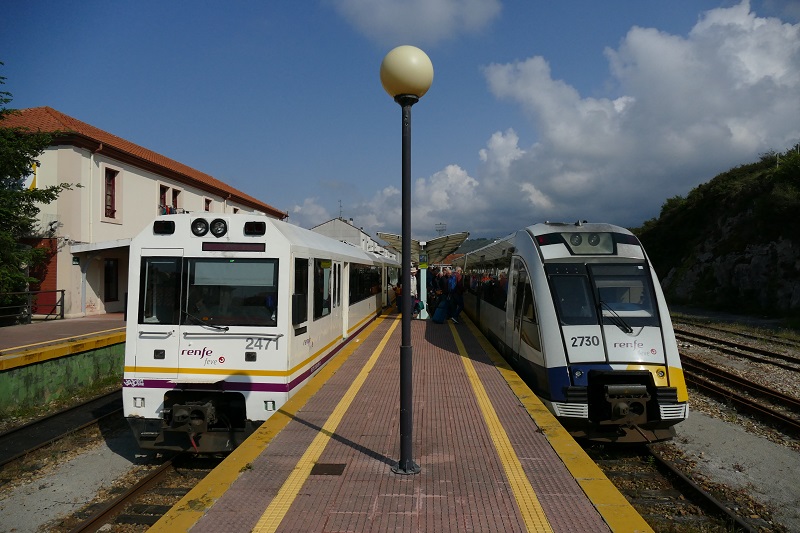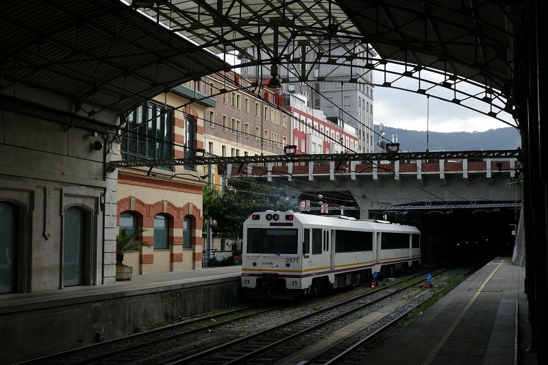 Om kwart over zes bereiken we de grote stad Bilbao op het breedspoorstation Abando, om ten slotte vijf kwartier later van het aanvankelijk lastig te vinden smalspoorstation van Renfe/FEVE te vertrekken voor een nog eens ruim 3 uur durende rit over meterspoor naar de kuststad Santander. Ook dat wordt een buitengewoon interessante rit over een zeer bochtig traject met een grote afwisseling aan landschappen, stationnetjes, industrie en zelfs zicht op strand en zee. Onderweg moet op een klein station worden overgestapt op een andere trein, omdat gekruist moet worden en het tweede spoor bezet is met de ‘Transcantabrico’, een zeer luxe trein van zo’n 13 rijtuigen (!) die exclusieve reizen biedt over het smalspoor tussen San Sebastián en Ferrol. Eerst vertrekt onze trein terug richting Bilbao, vervolgens arriveert vanuit Santander een ander treinstel. Dat biedt alle kans om ook de luxe trein te fotograferen. Wie overigens op internet kijkt wat een reisje daarmee kost moet al gauw vaststellen dat dat financieel gezien voor een normaal mens niet is weggelegd…