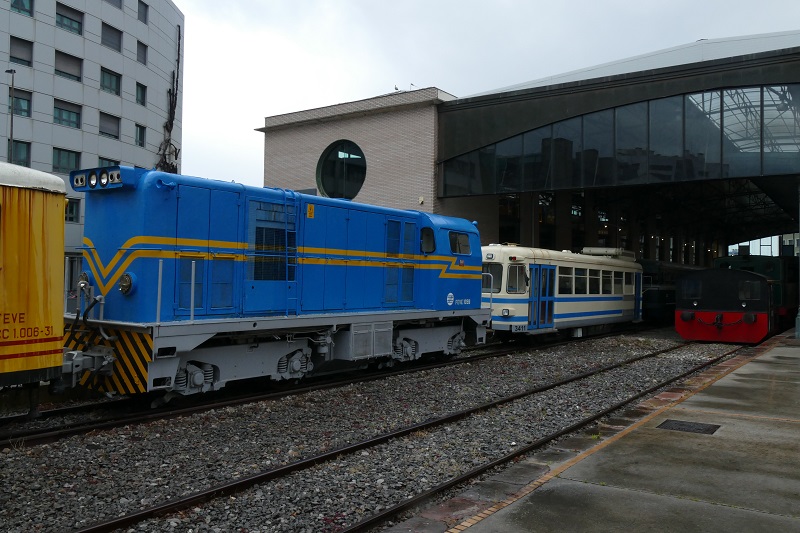 Het ‘Museo Ferrocarril de Asturias’ in Gijón met de sterk op de NS 2400 lijkende ex-FEVE dieselloc 1059 (Alstom), ex-FEVE motorwagen 2730, afkomstig van de Belgische NMVB en een rangeerloc van het Duitse type Köf op breedspoor; 21 mei 2023. Foto: Paul Muré.