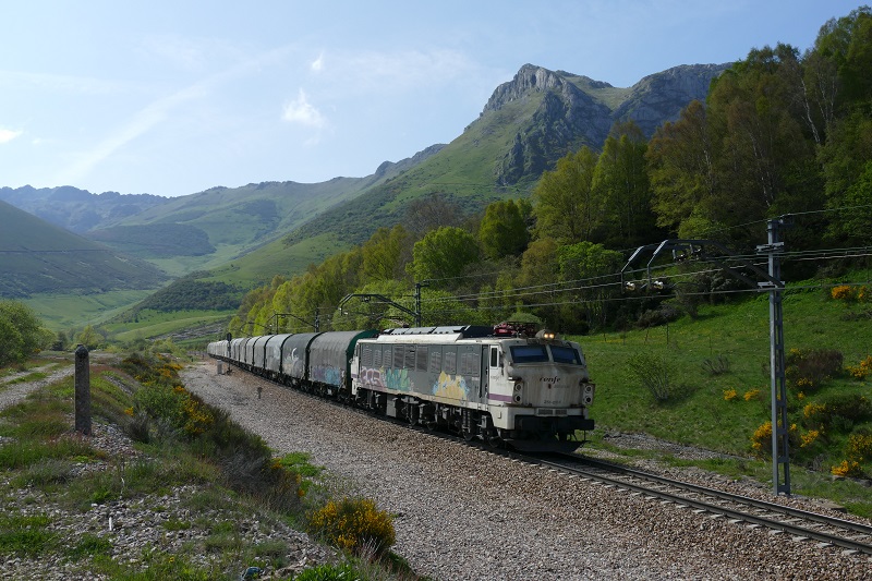 Renfe Mercancías loc 251-010-5 bereikt met een goederentrein in noordelijke richting de tunnel onder de Pajares-pas bij Busdongo, 22 mei 2023. Foto: Paul Muré.