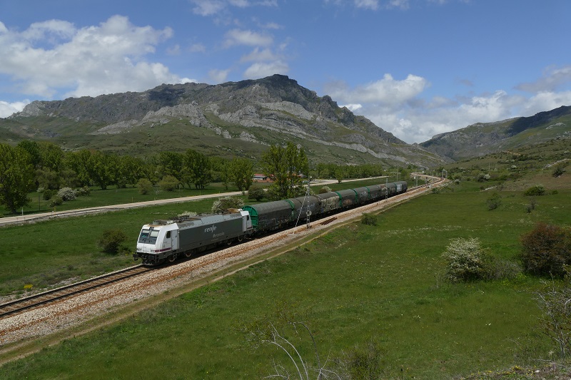 Renfe Mercancías loc 253-052-5 nadert met een goederentrein in zuidelijke richting het station Villamanín aan de Pajares-pas, 22 mei 2023. Foto: Paul Muré.