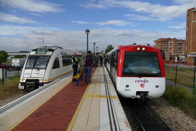 Het huidige beginpunt van de meterspoorlijn van León naar Bilbao is het station Asunción/Universidad in León. De groep begint in treinstel 2611 aan een lange reis, 23 mei 2023. Foto: Paul Muré.