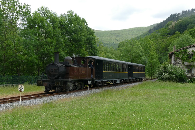 Stoomloc FV 104 met museumtrein van het Baskisch spoorwegmuseum in Azpeitia tussen Lasao en Azpeitia, 25 mei 2023. Foto: Paul Muré.