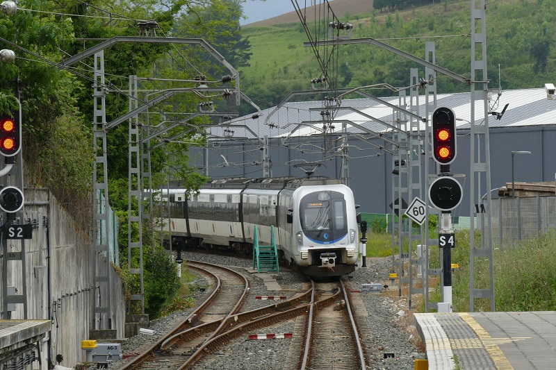 Euskotren treinstel 921 nadert station Zumaia als trein uit Bilbao naar Amara-Donostia, 25 mei 2023. Foto: Paul Muré.