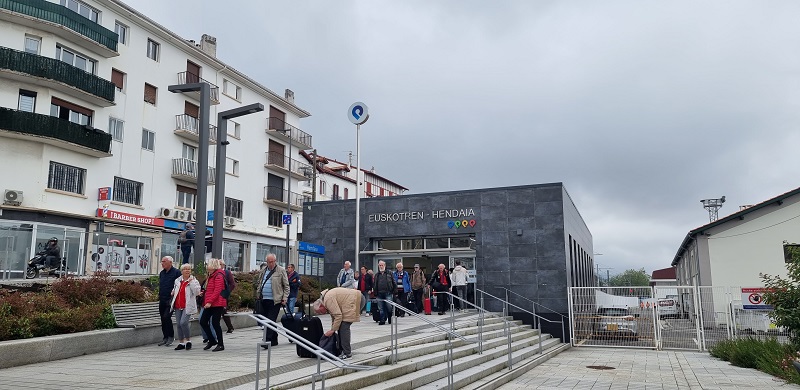 Op dag 2 is er nog alle tijd om Bordeaux verder te verkennen, een stad die eigenlijk een langer bezoek waard is. Om 14.21 uur wordt de reis richting Spanje voortgezet met een TGV naar het grensstation Hendaye. De rit gaat tussen Bordeaux en Dax over de route waar in 1955 het wereldsnelheidsrecord werd verbroken. De van vele foto’s bekende bovenleidingconstructie op die lijn hangt er nog steeds en doet sterk denken aan de ‘gotische bogen’ tussen Utrecht en Hilversum. Na aankomst in Hendaye is er een kwartier voor de overstap op de eerste Spaanse, of beter gezegd Baskische trein op meterspoor, waarmee we naar Donostia/San Sebastián reizen. Donostia is overigens de Baskische naam; San Sebastián de Spaanse. Groep A arriveert met enige vertraging te Hendaye en haalt op het nippertje de aansluiting op de metro-achtige trein van de Baskische spoorwegmaatschappij Euskotren naar Donostia. Deze vertrekt op een eigen station, min of meer op het voorplein van het SNCF-station. De vele tunnels op het traject verklaren de bijnaam ‘El topo’ (de mol). Intussen maken we kennis met de dichte bebouwing langs het traject, waarbij de balkonnetjes van de appartementen soms tegen de perrons aan leunen.