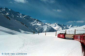 Op de heenreis werd nauwkeurig de loop van de Rijn gevolgd, eerst tot Basel en vervolgens via Schaffhausen, de Bodensee, Chur tot aan de oorsprong van de rivier nabij Thusis (de Hinter-Rhein) en Disentis/Mustér (de Vorder-Rhein). Chur was de eerste verblijfplaats voor drie nachten. Er was van daaruit over de Rhätische Bahn een rondrit onder meer door de onlangs geopende Vereinatunnel georganiseerd, met drie eigen rijtuigen (de Stiva Retica) gekoppeld aan diverse reguliere treinen. Op de vrije dag waaierden de deelnemers, alle voorzien van een Swiss Pass, zoals gebruikelijk uit in alle windrichtingen. De meest sportieven waagden zich aan een Schlittenfahrt (snelle tocht per sleetje) van Preda naar Bergün. Anderen gingen zich te buiten aan lange treinreizen naar Appenzell of Tirano. De volgende verblijfplaats was Martigny, die de groep met de Glacier Express via de Oberalppass bereikte. Niet zonder geluk, want twee dagen tevoren was de pas vanwege lawinegevaar nog gesloten geweest. De excursie vanuit Martigny ging naar de BAM, waar een eigen trein de smalspoorlijnen van Morges naar l’Isle en Bière bereed. Deze trip met fotostops bevatte een lunchpauze op het splitsingspunt in Apples, waar het culinaire hoogtepunt van de reis werd bereikt. De reeds goede groepssfeer werd daardoor nog aanzienlijk verbeterd. Op de vrije dag in Martigny putte een ieder zich uit in het bedenken en maken van originele en lange railtrips, zoals naar Centovalli, Le Châtelard, Genève en Zermatt. Vervolgens verplaatste de groep zich naar Luzern. Onderweg in Montreux wachtte een aangename verrassing: voor ons stonden twee historische eersteklasserijtuigen gereed, die achter aan de Regional Panoramic Express naar Zweisimmen werden gehangen. Hoewel de vervolgrit in de middag via Thun en Konolfingen naar Luzern wat verregende, kon ook deze dag dus niet stuk. De laatste vrije dag van deze winterreis bood nogmaals een variatie aan bestemmingen: Verkehrshaus in Luzern, Aarau, Engelberg, Zürich en vele andere. Omdat de terugreis pas om één uur in Basel begon, bedacht vrijwel iedereen nog een omweg naar deze stad. In het Hauptbahnhof werden allen een uur voor vertrek in of rond de restauratie aangetroffen voor nog een snelle lunch. Voordat men het goed en wel besefte, was de reis al weer afgelopen.
