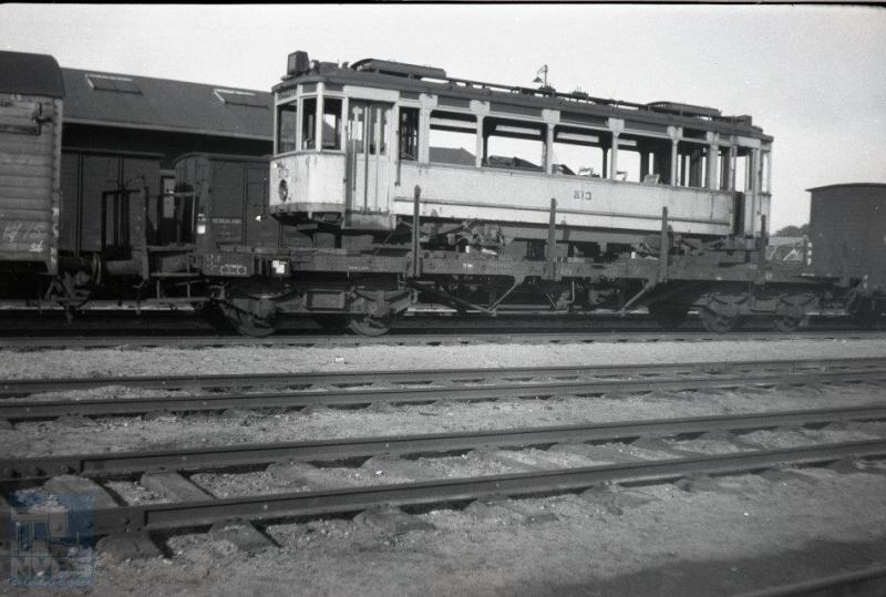 Het duurde lang voor alle trams en autobussen uit Duitsland terugkwamen. De exemplaren die de pech hadden in de Russische zone van Duitsland te zijn beland, kwamen helemaal niet meer terug: die vormden ‘oorlogsbuit’. Vier maanden na de bevrijding arriveert motorrijtuig 813 van de HTM, ‘uitgeleend’ aan Duisburg, in het land. In tegenstelling tot Rotterdam kwamen de Haagse trams per trein terug. De wagen staat op een vierassige rongenwagen van de NS hier in Utrecht. De stroomafnemer en alle ruiten ontbreken: de firma Beijnes of Werkspoor had nog enig werk te doen voor de 813 weer in de stad op de rails kon verschijnen. Na verloop van tijd kwamen alle 800-en weer in dienst behalve 818 die in Bremen te zwaar werd beschadigd. (foto 109.576; 6-9-1945)