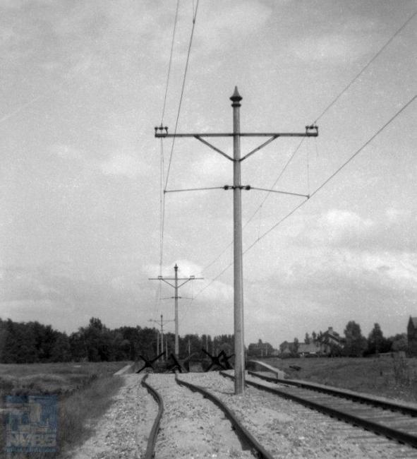 Ook de trambedrijven hebben veel te lijden gehad van de oorlog. Bij de HTM lijn I² naar Leiden hebben mensen in de Hongerwinter op sommige plaatsen de dwarsliggers gesloopt om op te stoken, zoals hier bij de halte Laboratoria in Leiden. Maar ook al zouden die er nog wel liggen, de tankversperring in de vorm van ‘egels’ iets verderop had doorrijden sowieso verhinderd. (foto 109.802; 14 juni 1945)