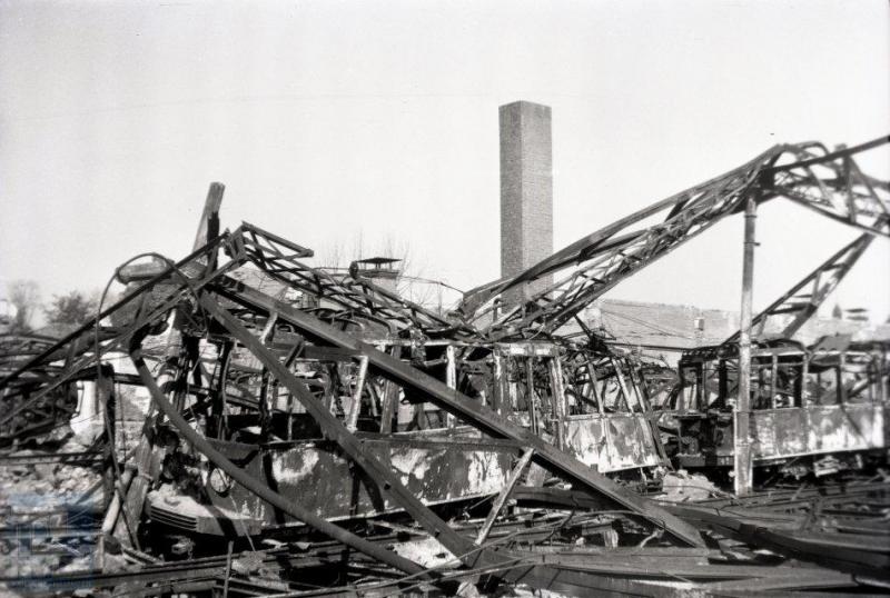 Van de Nederlandse trambedrijven heeft de GETA, de gemeente Elektrische Tram Arnhem, wel het meest te lijden gehad van de oorlog. Arnhem beschikte volgens velen over de mooiste vierassige motorwagens, gebouwd door Beijnes in 1929, waarvan er vele samen met ouder materieel door een voltreffer op de remise aan de Westervoortschedijk verloren zijn gegaan. Dit moet gebeurd zijn ten tijde van de Slag om Arnhem, 18 of 19 september 1944. Op de foto onder andere motorwagen 70, een van de slachtoffers. De stad en de trambanen waren eveneens dermate beschadigd, dat de tram na de oorlog niet meer in het straatbeeld is teruggekomen. Gelukkig rijden er nog wel steeds trolleybussen. En niet te vergeten replica motorwagen 76 in het Openluchtmuseum . Ook de elektrisch tramlijn in Zeeland tussen Middelburg en Vlissingen was zodanig vernield, dat men geen heil zag in herstel en er bussen op dit traject werden ingezet. Het nog bruikbare rollend materieel ging naar de NBM. (foto 129.069; 28-8-1945)
