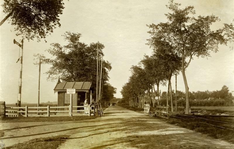 We bevinden ons nog steeds op de Harlingerstraatweg en we kijken in de richting Marssum. Hier zien we de kruising met de NFLS-lijn Leeuwarden – Stiens – Metslawier/Tjummarum. De NFLS had bij Leeuwarden Halte enkele armseinen om de tramkruising te beveiligen. Een daarvan staat hier links op de foto die rond 1907/1908 is genomen.