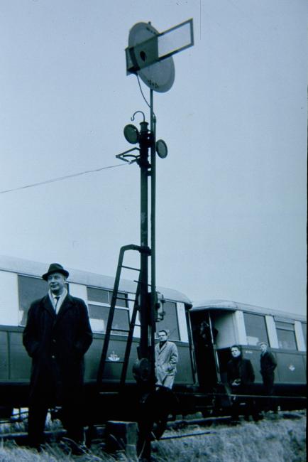 Ondanks dat het RTM-net vrijwel geheel enkelsporig was, kende het nauwelijks seinpalen. Er stond er echter wel één voor de brug over het Kanaal door Voorne, en wel aan de westkant. Komend van die kant was het moeilijk te zien of (er een tegenligger op de brug in aantocht was) de brug geopend was; het sein werd ook bediend door de brugwachter. Foto: F.J. Hoevenagel, 25 oktober 1964.