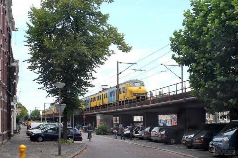 We maken een grote sprong in de tijd: van zwartwit naar kleur en in een volgende eeuw: een foto van de situatie zoals deze jarenlang in Delft heeft bestaan, NS-treinstellen plan V 933-458-943 op het viaduct aan de Spoorsingel als trein 5045 op weg naar Dordrecht. Frans Boom maakte deze plaat op 16 augustus 2011.