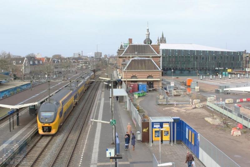 Tegenwoordig gaat de trein onder de grond door Delft heen en is er een geheel nieuw station gekomen, dat aanschuurt aan het oude. Het interieur is fraaier dan de rechthoekige doos die de buitenkant vormt. Foto van Ciril van Hattum, 28-2-2017.