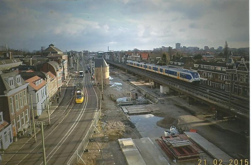 Deze foto is geschoten op de laatste of een-na-laatste dag dat het viaduct in gebruik was: 21 februari 2015. Rechts rijdt een SLT-treinstel naar Roosendaal en links lijkt het of ′de gele tram′ is teruggekeerd, maar het betreft hier een reclametram van lijn 1. De foto is van de hand van C.J.W. Schaap (NVBS-fotonummer 5412.2374).