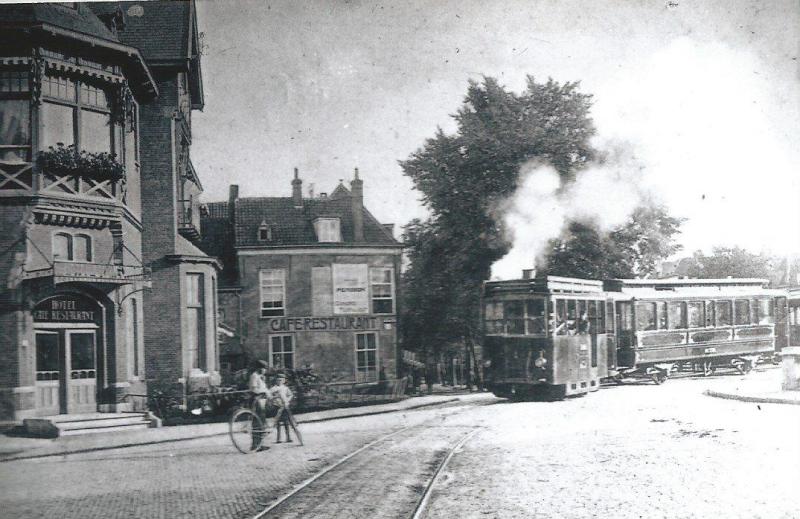 Na de railroader kwam er een ′gewone′ paardentram en weer daarna, vanaf 31 juli 1887 om precies te zijn, een stoomtram. Ook deze vertrok vanaf het Haagse Huygensplein. Inmiddels had de HTM het personenvervoer in Den Haag en ook naar Delft in handen gekregen. We zien locomotief 1 -fabricaat Henschel uit Duitsland- met een paar rijtuigen aan het Noordeinde te Delft. Evenals zijn voorgangers reed de stoomtram op enkelspoor; onderweg waren er vier wisselplaatsen. De nu in onze ogen vreemde spoorwijdte van de railroader was al eerder omgezet naar normaalspoor. De foto komt uit de verzameling van M. van Witsen (NVBS-fotonummer 255.522) en moet ongeveer in het jaar 1900 zijn gemaakt.