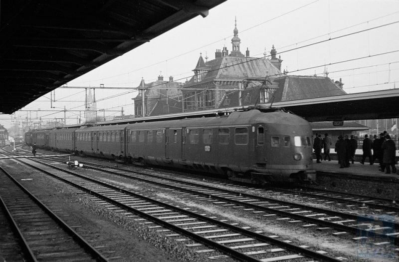 Een lange personentrein van Delft naar Den Haag staat hier op spoor 3 klaar voor vertrek. We zien alleen het staartstuk van deze trein: treinstel ElD3 461 en daarvoor een postrijtuig Pec. Onzichtbaar op de foto zijn het tweetje en viertje die hier weer voor stonden. De top van het stationsgebouw torent fraai boven de perronoverkapping uit. Op deze locatie is op 8 december 1962, de dag waarop R. Ankersmit deze foto maakte, van de viaductbouw nog niets te bespeuren (NVBS-fotonummer onbekend).