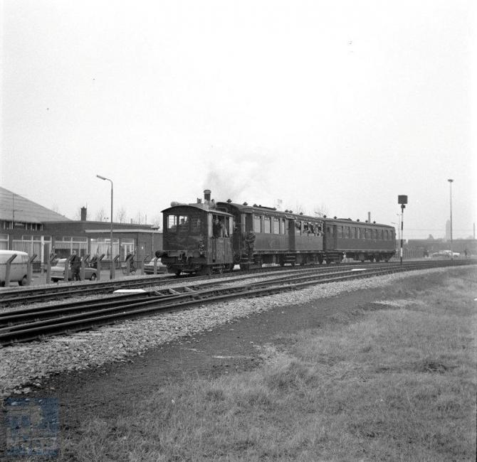 Behalve de HTM heeft ook de WSM (Westlandsche Stoomtramweg Maatschappij) Delft aangedaan. De lijn liep van Maaslandsche Dam via Schipluiden en Den Hoorn naar de Spoorsingel in Delft. Hoewel het personenvervoer op deze lijn al dertien jaar na de aanleg werd stopgezet (1925) zijn de rails nog heel lang blijven liggen. De Tramwegstichting (TS) heeft hier dankbaar gebruik van gemaakt. Op 15 december 1967 vierde het gezelschap Leeghwater, een studievereniging van werktuigbouwkundige studenten haar honderdjarig bestaan met een rit van Delft naar Naaldwijk over de oude WSM-tramlijn. De tram bestond uit locomotief 18, afkomstig van de Gooische Stoomtram en twee blokkendozen mat 24. Je zou dit de generale repetitie kunnen noemen van wat er de volgende dag stond te gebeuren: een rit die velen zich nog zullen herinneren. Toen reed loc 18 met vier blokkendozen voor TS-donateurs en NVBS-leden van Maaslandsche Dam naar Delft. De sporen zijn blijven liggen tot 1970. De fotograaf is A.E.E. van Donselaar (NVBS-fotonummer 1297.4090).