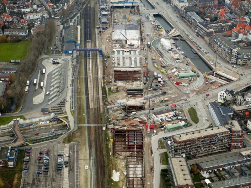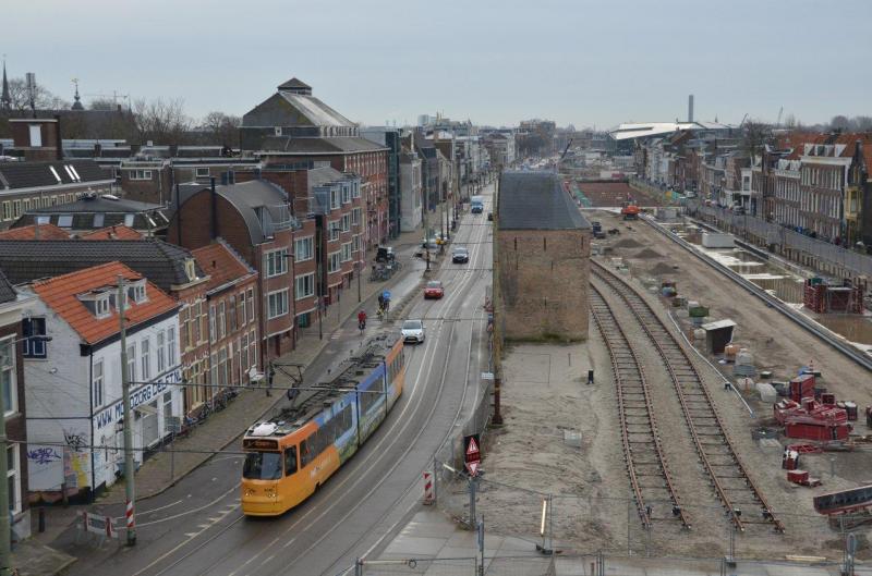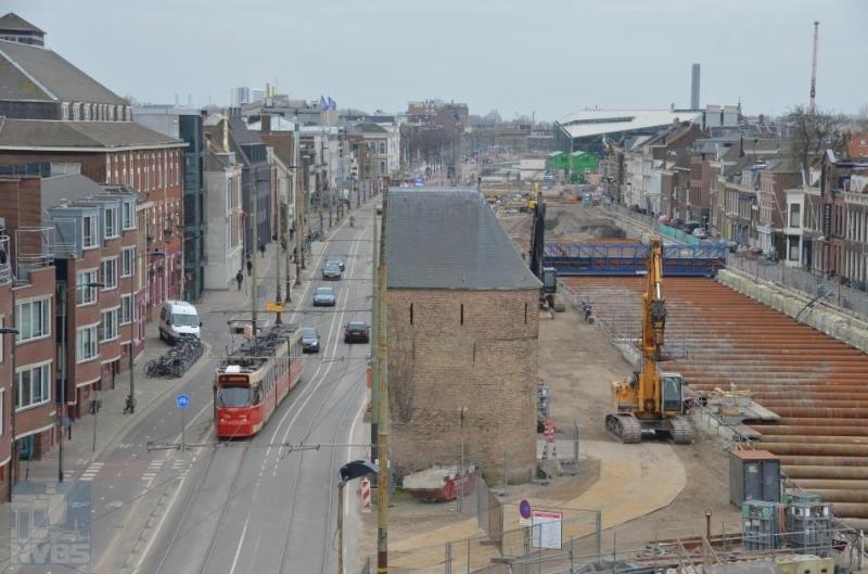 Deze foto laat de situatie zien van begin 2016. De tunnel is dan al een jaar in gebruik, dat wil zeggen met twee sporen. Deze ligt recht onder de Bagijnetoren op de voorgrond. Deze middeleeuwse toren, onderdeel van de stadsmuren, moest tijdelijk vijftien meter worden verplaatst voor de aanleg van de tunnel. De tram van lijn 1 rijdt nog steeds op het tijdelijk spoor. Rechts zien we de tweede tunnel voor spoor 3 en 4 en de parkeergarage in aanbouw: de vele vijzels moeten de muren behoeden voor instorting. In feite wordt het hele gebied tussen de beide huizenrijen ondertunneld. Raymond Naber heeft de foto op 19 maart 2016 gemaakt vanuit de molen De Roos, die op sommige dagen voor bezoekers geopend is.