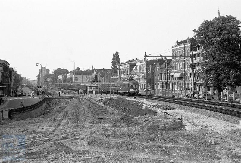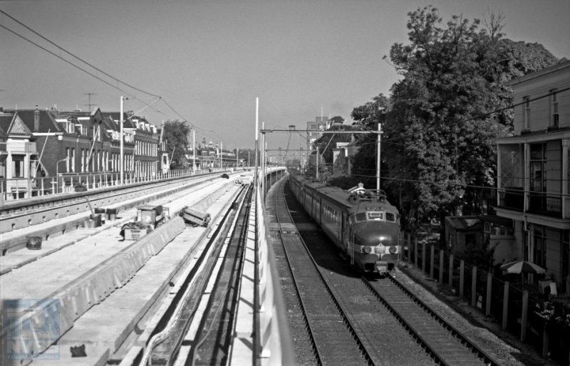 In 1961 zijn de werkzaamheden om de sporen naar een hoger plan te brengen al in volle gang. De Westersingelgracht is gedempt om de aanleg van een hulpbaan mogelijk te maken. Ter hoogte van de overweg Hugo de Grootstraat rijdt trein 1151 van Amsterdam naar Bergen-op-Zoom nog op oude rails. De trein bestaat uit ElD4 660 en ElD3 444. Ook deze foto is geschoten door R. Ankersmit en wel op 25 mei 1961 (NVBS-fotonummer onbekend).