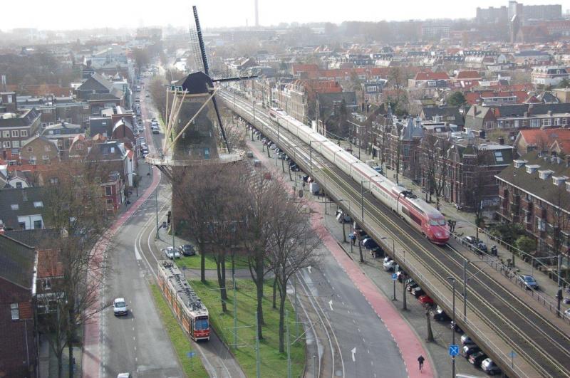 Deze prachtige foto, die ook de voorkant van de Op de Rails-kalender 2016 heeft gesierd, toont de situatie zoals deze in 2007 was. Stellingmolen De Roos staat op de voorgrond, op het viaduct rijdt een Thalys-trein en links zien we HTM-lijn 1 met GTL 3031. PCC-cars zijn verdwenen en reeds jaren geleden fuseerden de HTM-lijnen 8 en 37 tot een nieuwe lijn 1, (een van) de langste tramlijn(en) van Nederland. Raymond Naber fotografeerde dit tafereel op 21 maart 2007.