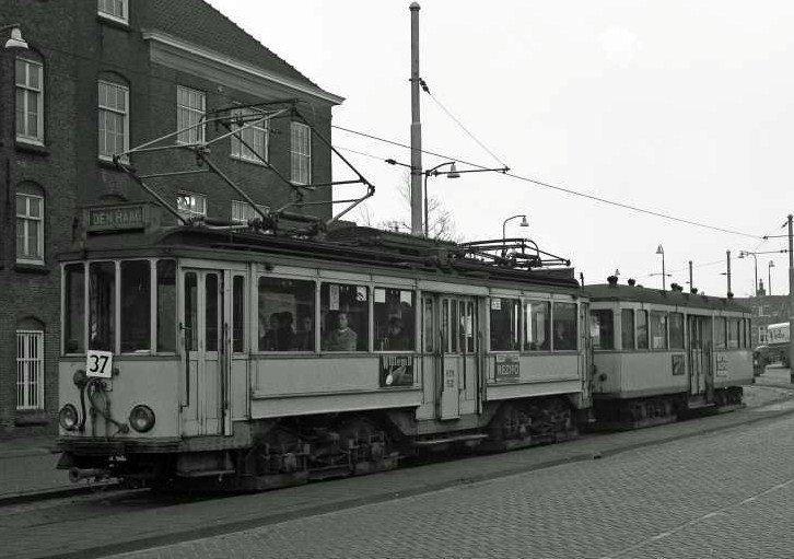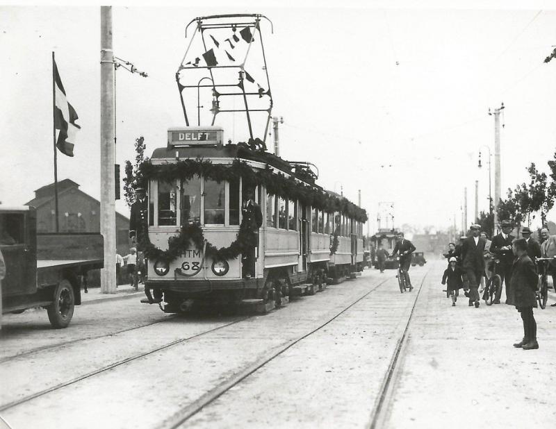 Na de paardentram en de stoomtram duurde het tot 1 juli 1924 voordat de stad ′elektrisch′ kon worden bereikt. Op deze foto zien we de interlokale motorwagen 68 met een salonwagen (101-120) op de Reineveldbrug te Delft tijdens de officiële opening van de nieuwe Reineveldbrug op 2 september 1931. Beide zijn over de gehele lengte voorzien van groene guirlandes en de 68 heeft vlaggetjes in de pantograaf. Tegelijkertijd werd ook de route verlegd via Delftweg – Broekmolenweg – Vrijenbanselaan – 2e Reineveldbrug – Wateringsevest. Het Haagse eindpunt ligt niet meer aan het Huygenspark maar is verplaatst naar het Plein, zodat de tram ook het stadscentrum kon bereiken. Op last van de Duitse bezetter werd het Plein op 5 augustus 1940 verlaten en werd de Turfmarkt het nieuwe eindpunt. De foto is van J.H.J. van Aken van der Laan (NVBS-fotonummer 185.947)
