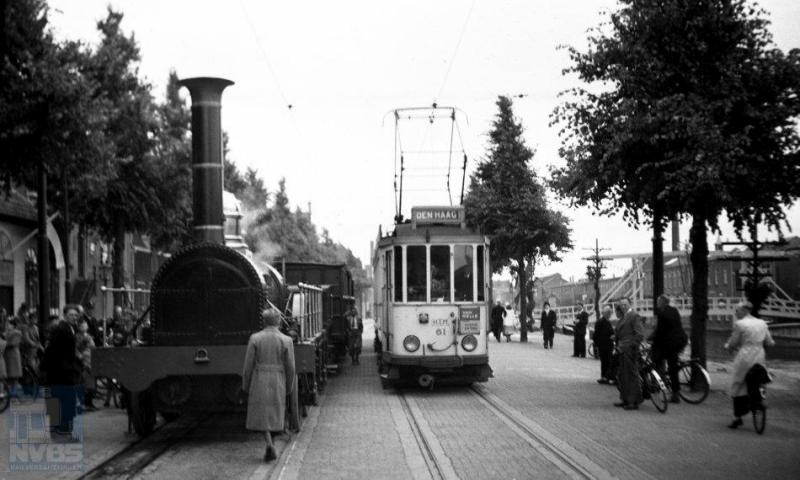 Het honderdjarig bestaan van de Technische Hoogeschool kon in de oorlog (1942) niet goed worden gevierd, dus toen in 1948 het Delftsch Studenten Corps honderd jaar bestond, werd er een groot feest georganiseerd ter gelegenheid van beide jubilea. De tien jaar oude replica van locomotief ′De Arend′ gaf acte de présence en staat hier naast HTM-motorwagen 61 op de Westvest. Omdat De Arend een andere spoorwijdte kent, werd op een van de tramsporen een stuk breedspoor aangelegd terwijl de HTM het even met enkelspoor moest doen. De 61 op weg naar Den Haag staat hier dus op ′verkeerd′ spoor. Op 11 juli 1948 vastgelegd door J.A. Bonthuis (NVBS-fotonummer 529.205).