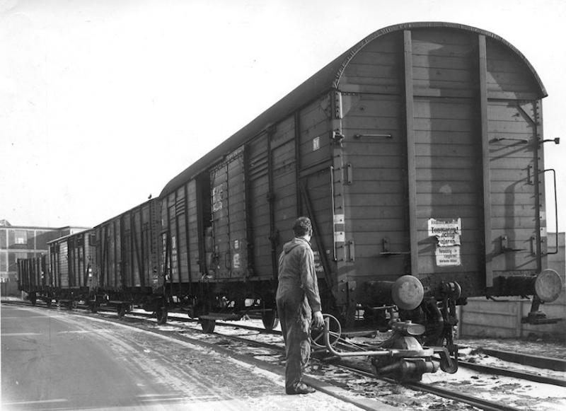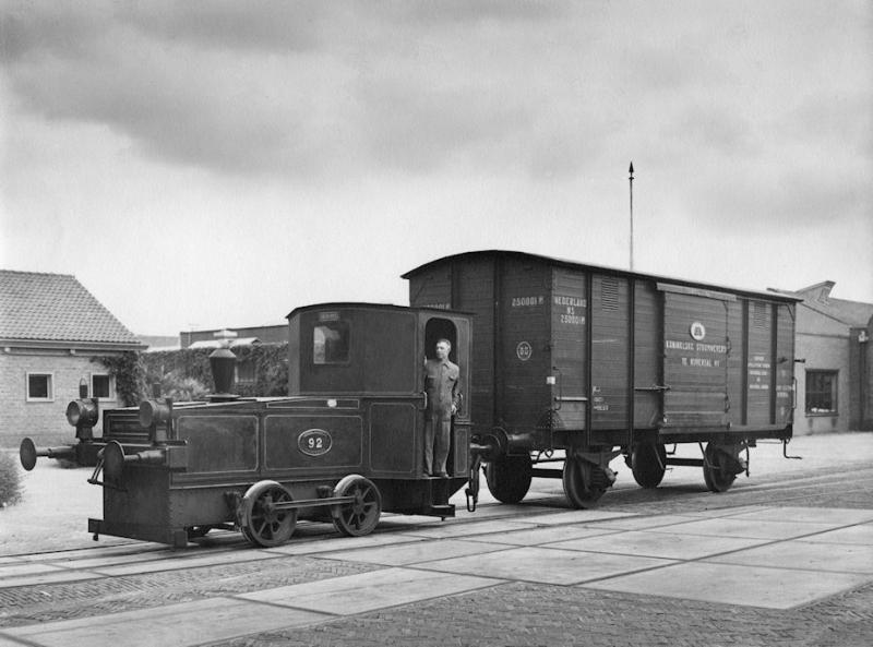 Moderne ontwikkelingen waren vaak het eerst te zien op fabrieksspoor. De Koninklijke Stoom Weverij in Nijverdal kocht al in 1911 en in 1913 een benzinelocomotief van de Duitse fabrikant Oberursel terwijl bij de Nederlandse Spoorwegen pas in 1927 een benzinelocomotief verscheen. De Oberursel uit 1913 zag er veertig jaar later nog hetzelfde uit. De loc droeg het NS nummer 92 omdat zij beperkt op NS sporen mocht komen. Achter de loc staat één van de twee eigen goederenwagens van de KSW. (foto Koninklijke Stoom Weverij/Nijverdal ten Cate)