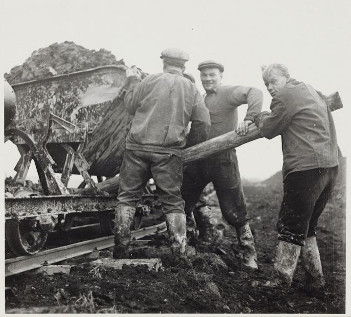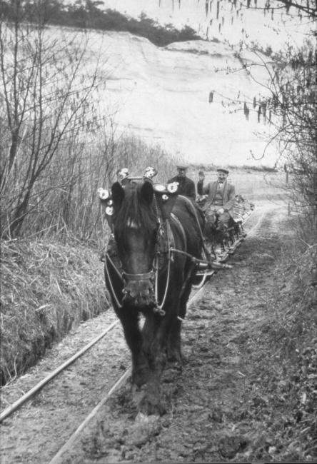 Vroeger werden kleigroeves terrasvormig afgegraven. De klei werd met de schop steeds een terras hoger gegooid en belandde uiteindelijk op de begane grond in een boerenkar. Smalspoor betekende een enorme verbetering, want nu kon de klei op de bodem van de groeve in kipkarren geschept worden. De kipkarren van de Electrische Dakpannenfabrieken Gebr. van Cleef in Belfeld werden tot het einde in 1963 met een paard over spoor met 600 mm spoorwijdte uit de groeve Maalbeek omhoog getrokken. (foto P. Buskens/ Heemkundevereniging Maas- en Swalmdal)