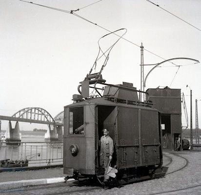 In Groningen, Nijmegen en Rotterdam reden kolentrams met de spoorwijdte en bovenleidingspanning van het stedelijke trambedrijf. Op 29 september 1942 vertrekt de enige Nijmeegse kolentram van de kolenbunker op de Waalkade naar de gasfabriek, waar de kolen via de kleppen bij de onderzijde gelost zullen worden. De rangeerder houdt een rode vlag vast. ( Foto J.A. Bonthuis)