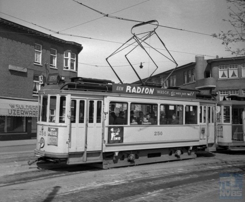 De oorlogsjaren hadden een zware tol geëist van alle Nederlandse spoor- en trambedrijven. Met minder materieel – veel rijtuigen waren gevorderd om in Duitsland gaten te vullen – maar ook met veel meer passagiers probeerde men de tramdienst draaiend te houden. Auto’s zag je bijna niet meer vanwege benzineschaarste; op de fiets durfde niemand want die werden in beslag genomen. Merkwaardig genoeg kwam het gevorderde trammaterieel voor het grootste deel na gedegen speurwerk weer terug en konden firma’s als Werkspoor dit zodanig opknappen dat het wel nieuw leek. Maar daar gingen wel wat jaren overheen en dus was het mooi dat de RET de HTM in 1946 kon helpen aan veertien oudere motorwagens die het Rotterdamse bedrijf kon missen. Op het remiseterrein aan de Lijsterbesstraat zien we rijtuig 171 staan. Aanvankelijk reden deze ‘Rotterdammertjes’ met bijwagen maar na enkele ongelukken vanwege remproblemen later zonder; ook vaak als ‘kindertram’. J. Voerman kiekte op 27 juli 1946. (NVBS-fotonummer 148.702)