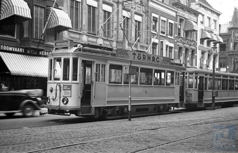 De wens van de HTM om buitenlijnen te gaan exploiteren, dus lijnen met een eindpunt buiten de stadsgrenzen, ging weliswaar later dan gewild, toch nog in vervulling. De eerste interlokale rijtuigen, die zowel onder 600 als onder 1200 Volt bovenleidingspanning konden rijden, behoorden tot een serie van zes tweeassers die, door HAWA in 1923 geleverd, de laatste jaren dienst hebben gedaan op lijn I³ naar Voorburg. Tot 1940, toen de Duitse bezetters deze plek voor zichzelf opeisten, lag het Haagse beginpunt op het Plein waar ook deze foto van nummer 5 door J.A. Bonthuis op 24 augustus 1935 is gemaakt. Na 1940 werd vanaf de Turfmarkt gereden. (NVBS-fotonummer 100.029)