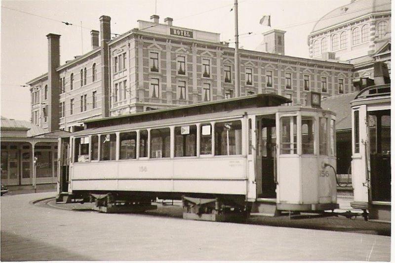 Niet alleen paardentramrijtuigen werden geschikt gemaakt voor de elektrische tractie, dit gold ook voor stoomtramrijtuigen. Zeven stuks, gebouwd tussen 1905 en 1913 afkomstig van de Delftse lijn, werden na stopzetting van de stoomtramdienst in 1924 omgebouwd tot elektrische aanhangwagen, maar wel voor dezelfde Delftse lijn. Rond 1930 verhuisden deze wagens naar de remise Scheveningen om ingezet te worden op de drukke lijnen 8 en 9. Rijtuig 156 staat hier bij het eindpunt van lijn 8 op het Gevers Deijnootplein te Scheveningen, voor het inmiddels afgebroken Palace Hotel. De foto is gemaakt door C. van Hattum op 28 mei 1955. (NVBS-fotonummer 1203.054)