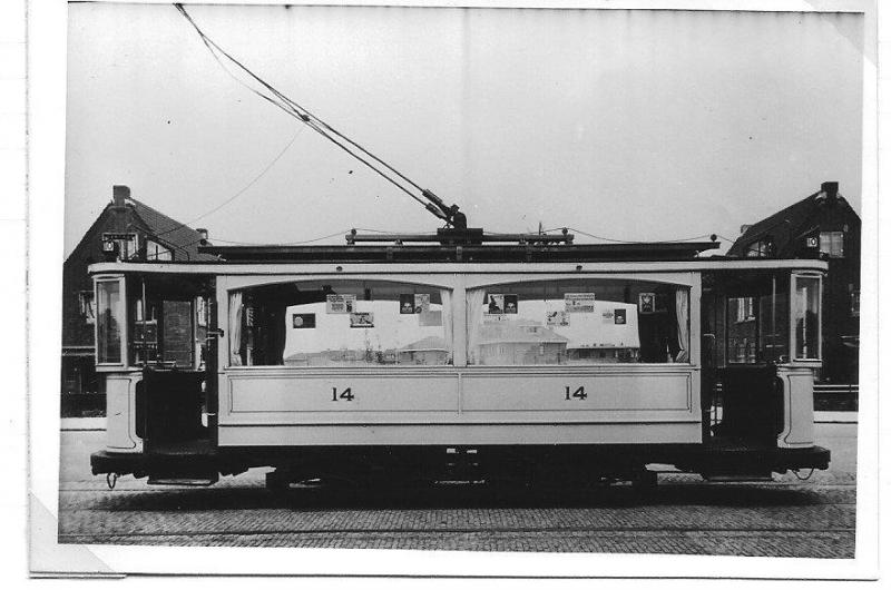 De eerste elektrische beugeltrams waren tweeramers. Deze foto van nummer 14 is van later datum, want de balkons zijn al gesloten gemaakt en de tram is crème geschilderd. Bij indienststelling was de 14 blauw met bruine panelen. Het moet ongeveer 1928 zijn geweest dat de wagen aan het eindpunt van lijn 10 – Kwartellaan – staat, klaar voor de volgende rit. Dit soort rijtuigen reden ook in andere steden; zij worden ‘Unions’ genoemd. Van deze serie van twintig kwam de helft uit Nederland (Werkspoor) en de andere helft, waar de 14 toe behoort, uit Duitsland (v.d.Zijpen/Charlier-Keulen). De meeste hebben dienst gedaan tot 1936. Althans bij de HTM, want in de oorlog –zij waren nog niet gesloopt– gingen zij op transport naar Posen, het huidige Poznan in Polen. De oorspronkelijke foto is gemaakt door de bekende Haagse tramhistoricus Ron F. de Bock, deze repro is van J. Voerman. (NVBS-fotonummer 150.003)