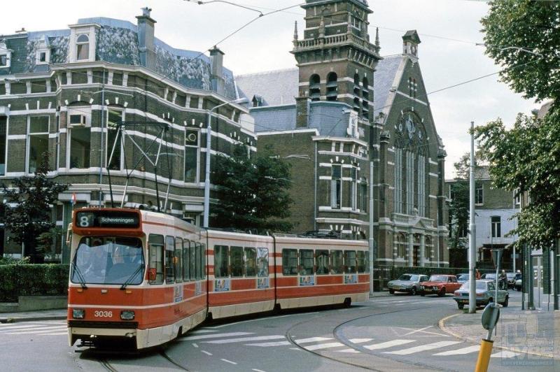 Vanaf 1980 veranderde de kleur van de Haagse trams van het vertrouwde crème geleidelijk in rood! Vanaf dat jaar kwamen er honderd dubbelgelede trams in dienst ter vervanging van de oudste PCC-cars. Personeelbesparing was het Leitmotiv om geleidelijk van de PCC’s afscheid te nemen: zij hadden een beperkte capaciteit vergeleken met de Gelede Tram Lang (GTL) die met minder personeel uit kon. BN (het vroegere La Brugeoise) in Brugge was de fabrikant. Ongeveer tien jaar later kwamen er nog 47 gelijksoortige GTL’s bij die echter in fraai blauw met gele deurpartijen waren geschilderd. Pluriformiteit was ‘uit’ bij de HTM en dus waren deze in 2004 ook allemaal rood met crème geworden. Het trambeeld in de stad werd steeds eentoniger: alleen de laatste zeventig PCC’s reden nog samen met GTL’s totdat ook voor hen, sommige nog geen twintig jaar oud, het doek viel. Vanuit de Scheveningse Duinstraat rijdt de 3036 de Prins Willemstraat in: niet de normale route van lijn 8 dus er zal wel iets aan de hand geweest zijn? De dia uit 1987 is van J. Vogels.