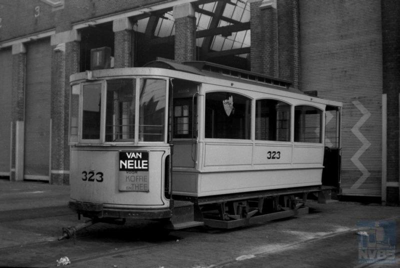 Reden de trams in Den Haag aanvankelijk zonder bijwagen, daar kwam spoedig verandering in toen meer mensen het nieuwe vervoermiddel hadden ontdekt. De goedkoopste manier om snel aan voldoende aanhangers te komen, was het geschikt maken van paardentramrijtuigen voor de elektrische tractie. Zij moesten natuurlijk ook in de crème kleurstelling worden gebracht. Rijtuig 323 stamt uit een van de latere series, maar had er toch al meer dan vijf en twintig jaar opzitten toen hij ‘elektrisch’ werd. J.A. Bonthuis heeft de foto op 5 januari 1941 gemaakt in de remise Scheveningen. (NVBS-fotonummer 109.078)